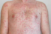 Simptome: Koors; prikkelbaarheid; waterblasies verskyn op ligrooi bultjies op die gesig, nek,