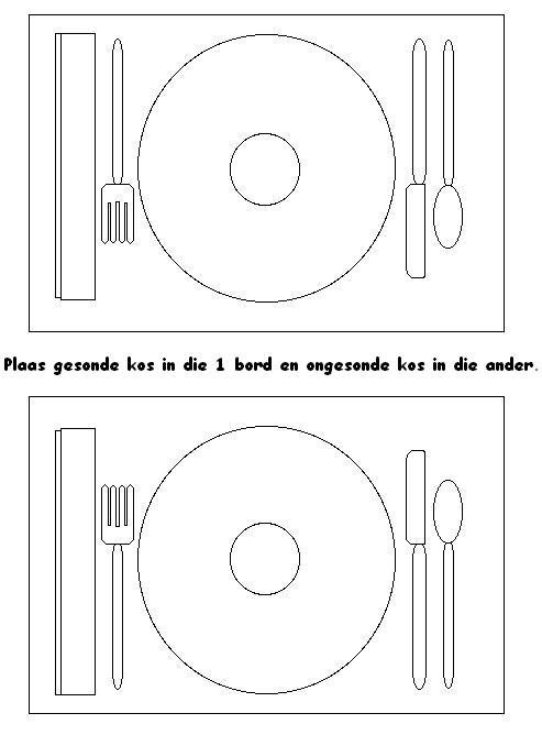 Knip prentjies uit 'n tydskrif van gesonde en ongesonde kos en plak dan in hul afsonderlike borde.