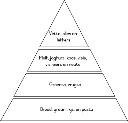 Gebruik 'n plakkaat of prente om aan die kleuters te verduidelik hoe kos in die volgende drie groepe verdeel kan word: